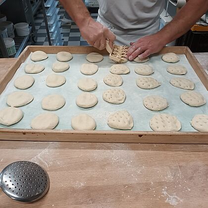 Kleine und große Menschen drängten sich in der großen Backstube um die unterschiedlichen Stationen, an denen Bäcker*innen und Konditorinnen den Besucher*innen ihr Handwerk vorstellten. Der Brotsommelier Jörg Meffert aus Lemgo präsentierte, im Dialog mit den Kollegen und Kolleginnen am Backtisch, spannende, fachliche Hintergrundinfos.